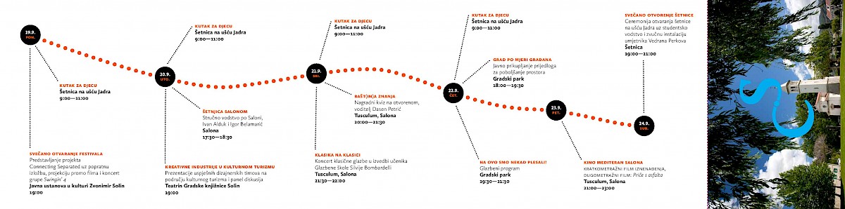 Posebno je zanimljiv Grad po mjeri građana u četvrtak (22.09.) na kojem će biti saslušani prijedlozi i problemi građana, te zabilježeni na karti grada. Prikupljene ideje važne su za održivost projekta Connecting Separated, odnosno spajanje novouređene šetnice i čitavog područja luke, uključujući kultnu gradsku plažu Mramorna s današnjim Solinom. U subotu (24.09.) će biti otvorena i šetnica na ušću Jadra, financirana sredstvima iz programa Connecting Separated, u sklopu kojeg su studenti međunarodne radionice osmislili projekte urbanih instalacija na šetnici. Postavljena je i nova urbana oprema i rasvjeta, a događaj će zatvoriti umjetnik Vedran Perkov svojom zvučnom instalacijom inspiriranom prostorom oko rijeke Jadro.
