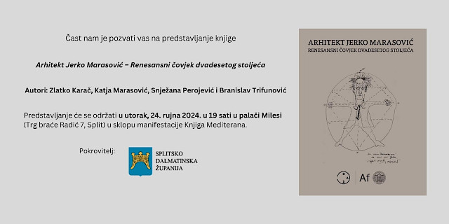 će se održati u utorak, 24. rujna 2024. u 19 sati u u Zavodu za znanstveni i umjetnički rad HAZU-a u Splitu, Trg braće Radić 7 (palača Milesi) u sklopu manifestacije Knjiga Mediterana.