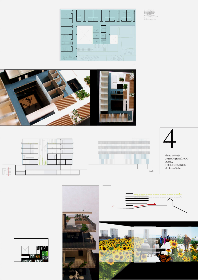 Odluka ovog rada je funkcionalno i volumenski razdvajanje prostora doma od sklopa poliklinike. Time je značajno olakšana artikulacija pojedinih dijelova u konstruktivnom, funkcionalnom i oblikovnom smislu. Organizacija etaža stacionara i pojedinačnih soba je kvalitetna. Posebno se cijeni raznovrsnost soba koja doprinosi humaniziranosti zgrade i ugodnijem boravku. Balkonima se dodatno izražava individualnost svake sobe i doprinosi kvaliteti oblikovanja.